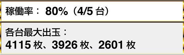 『バジリスク~甲賀忍法帖~絆』や『SLOT魔法少女まどか☆マギカ』では、最大獲得出玉6000枚超を確認している。