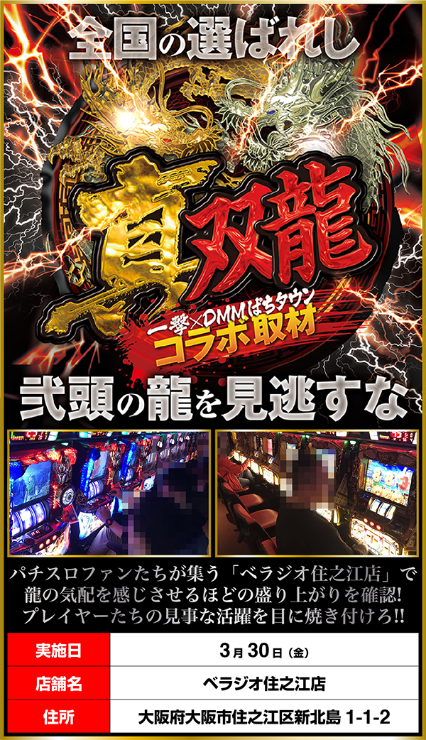 3月30日にパチスロ専門店の「ベラジオ住之江店」で「真双龍」をおこなった。