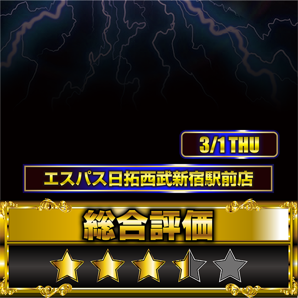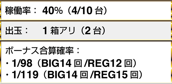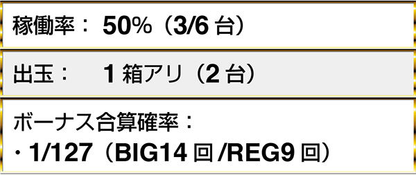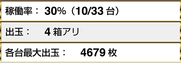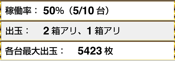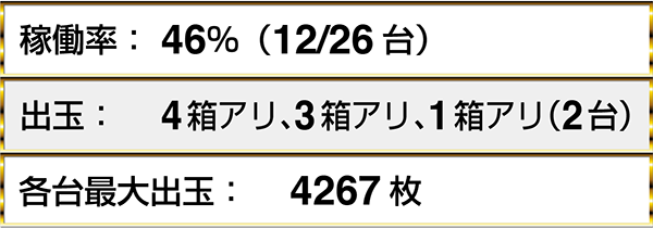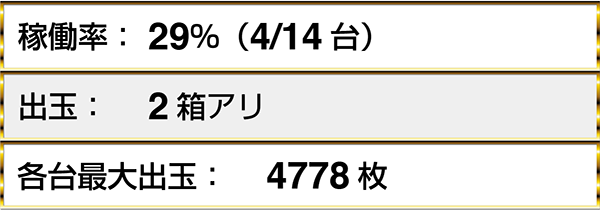 『バジリスク~甲賀忍法帖~絆』と『押忍!番長3』、『パチスロ モンスターハンター 月下雷鳴』をふくめると、4台で最大獲得出玉4000枚超えを目撃している。