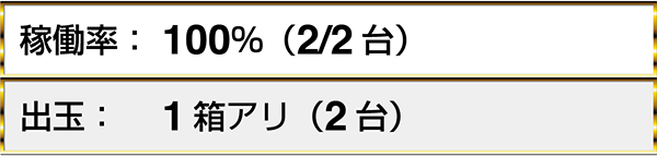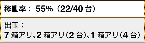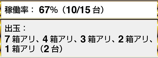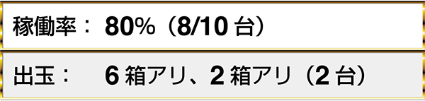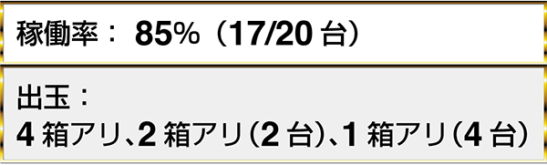 『マジカルハロウィン5』では、2名中2名が1箱以上の出玉を獲得していた。『バジリスク~甲賀忍法帖~絆』や『沖ドキ!-30』に7箱以上の出玉を獲得しているプレイヤーを確認済みだ。