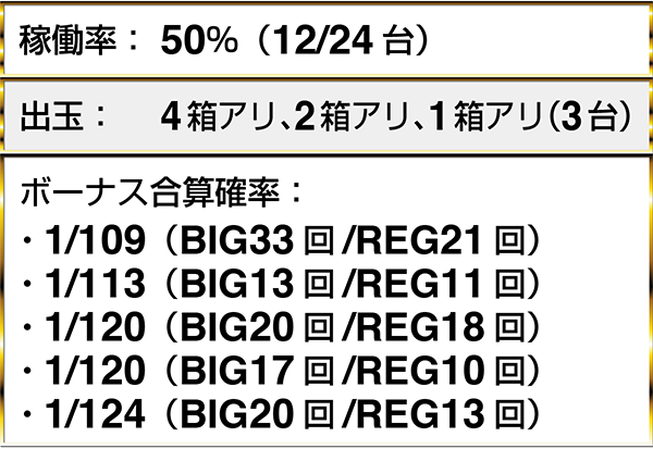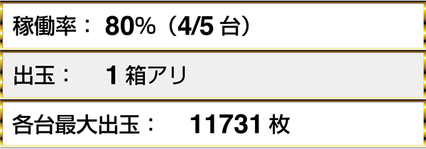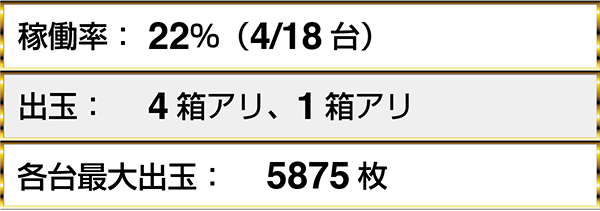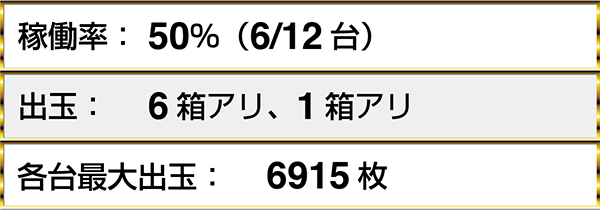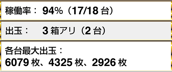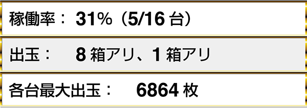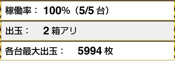 『バジリスク~甲賀忍法帖~絆』や『押忍!サラリーマン番長』をはじめ、6台以上で最大獲得出玉5000枚超えを確認。