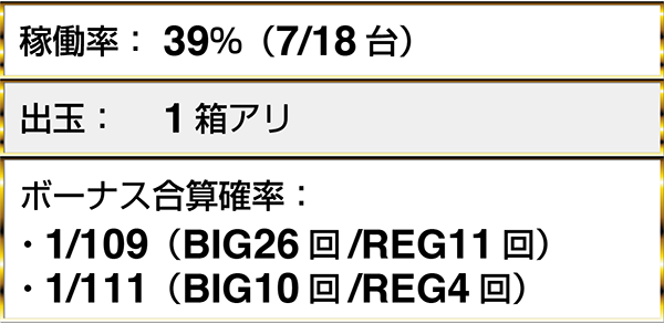 『マイジャグラーⅢ』にて、ボーナス合算確率1/130以下のデータを5台で目撃した。