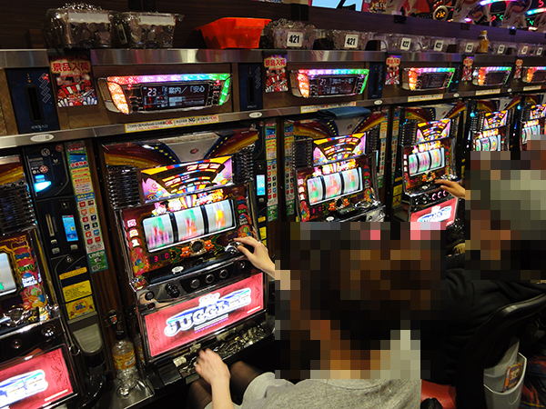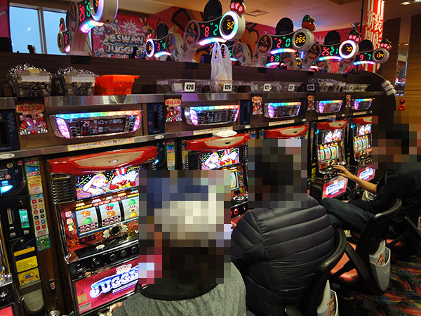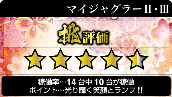 17時頃のホール内では、ジャグラーシリーズが大盛況! なかでも、ひときわ輝きを放っていたのが「マイジャグラーⅡ」と「マイジャグラーⅢ」だ。