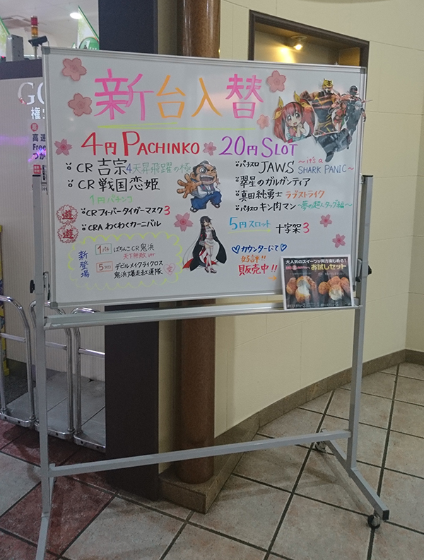 スタッフ特製のホワイトボードを使った新台紹介も分かり易く見やすい箇所に配置され、親しみやすさを覚えた。