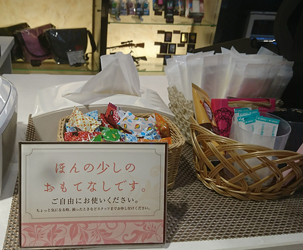 店内には、おしぼりや絆創膏、アメなどが用意されている。アメニティグッズが充実していることも、人気を集めている理由のひとつとなっているのだろう。
