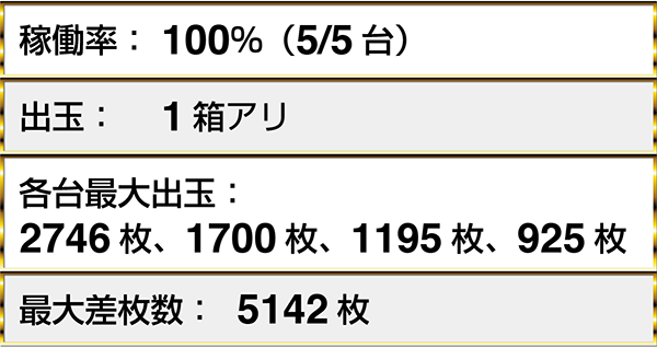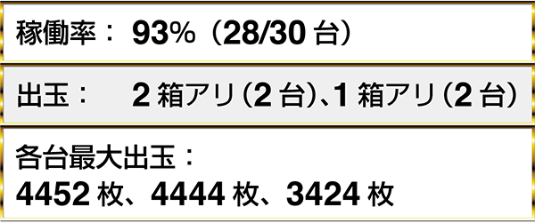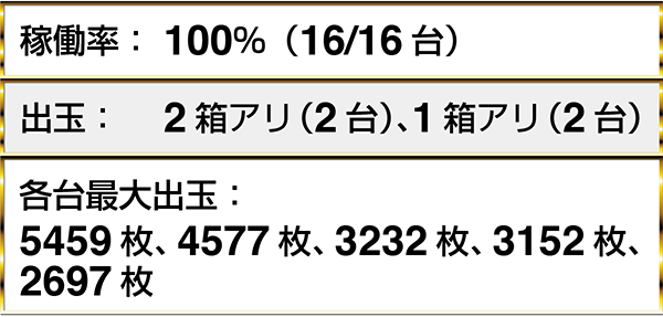『SLOT魔法少女まどか☆マギカ』と『パチスロラブ嬢』が満席となっており、2機種だけでみても8名以上のプレイヤーが1箱以上の出玉を獲得していた。