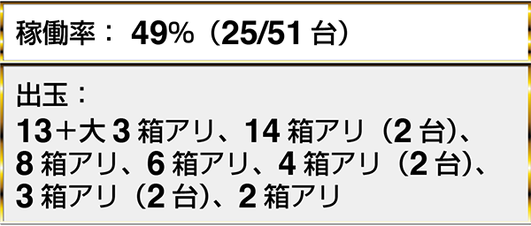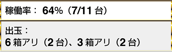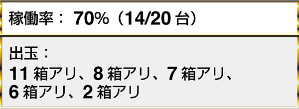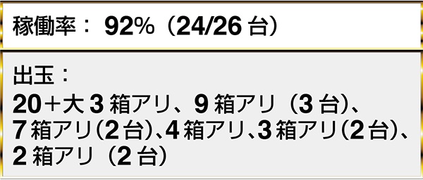『CRスーパー海物語IN沖縄4』と『ぱちんこCR真・北斗無双』だけでも、4名以上のプレイヤーが10箱以上の出玉を獲得しており、20箱以上の出玉も目撃した。