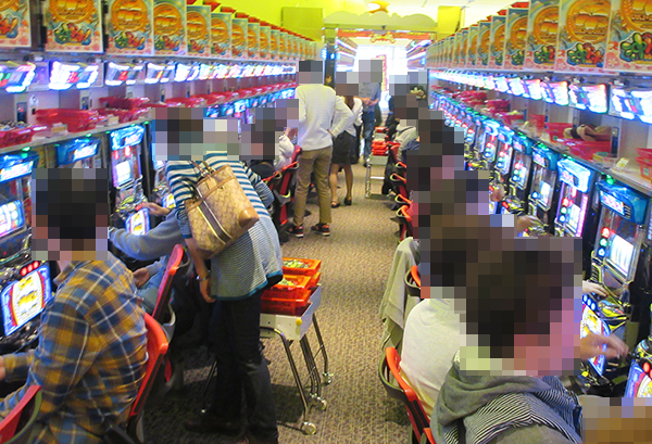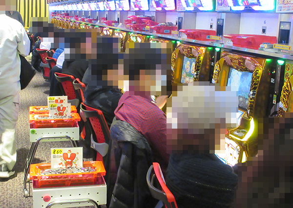 20円パチスロをみると、「バジリスク~甲賀忍法帖~絆」や「パチスロ聖闘士星矢 海皇覚醒」など、多数の機種がフル稼働となっていた。