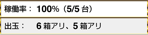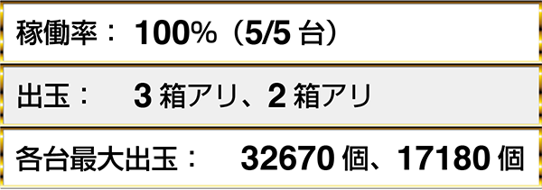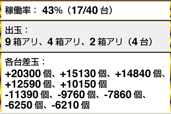 『CR大海物語4』は5台で差玉がプラス10000個を超え、マイナス10000個を上回った台は1台のみとなっていた。