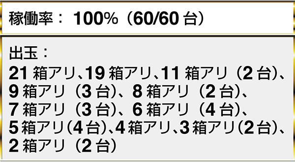 ・『ぱちんこCR真・北斗無双』でもっとも多かった最大獲得出玉は21箱