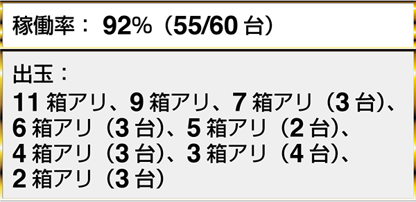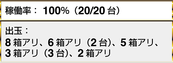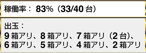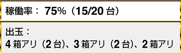 フル稼働となっていた『ぱちんこCR真・北斗無双』では25名が持ち玉で遊技を楽しんでおり、4名以上が10箱を超える出玉を獲得していた。