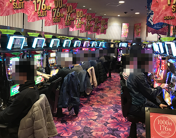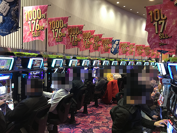 1000円/176枚パチスロもほぼ満席となるほどに高稼働。