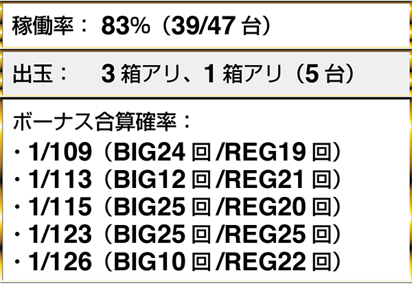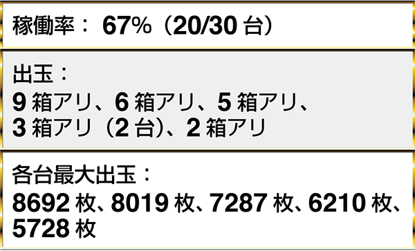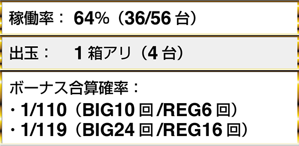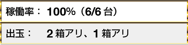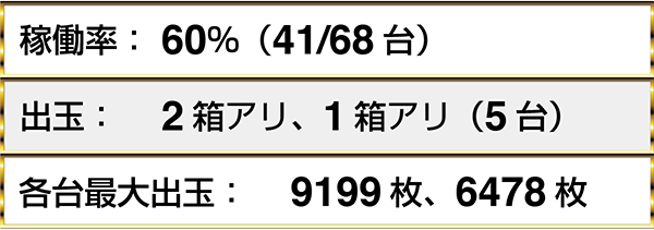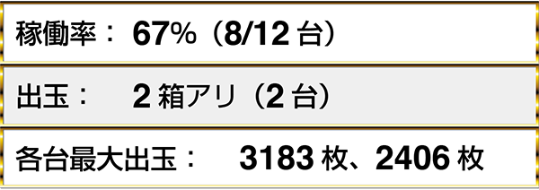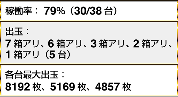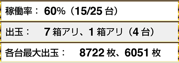 『ミリオンゴッド-神々の凱旋-』と『アナザーゴッドハーデス-奪われたZEUSver.-』の稼働率が朝イチから高く、2機種をあわせて最大獲得枚数が5000枚を超えるデータを7台以上で確認した。
