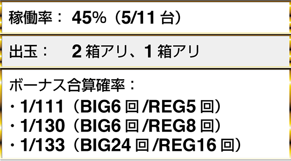 ・『マイジャグラーⅢ』にボーナス合算確率1/130以下のデータが5台