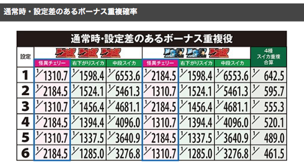 また、高設定ほど中段スイカからのBIG確率が高い。奇数設定ならば怪異チェリーと赤同色BIGが重複しやすく、偶数設定ならば異色BIGと重複しやすいといった特徴も把握しておこう。