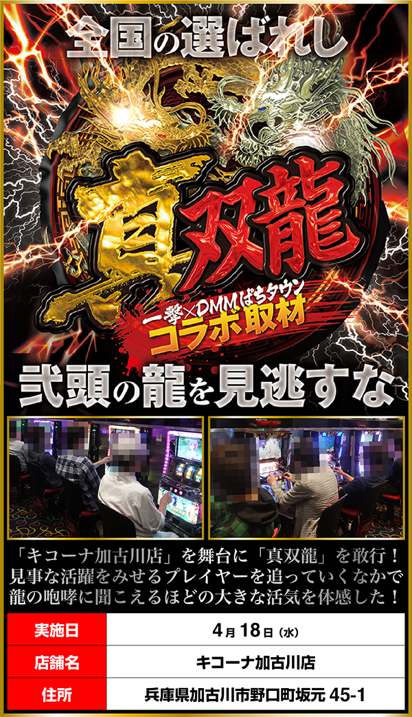 パチンコとパチスロをあわせて、1000台以上の設置台数を誇る「キコーナ加古川店」で「真双龍」を敢行。