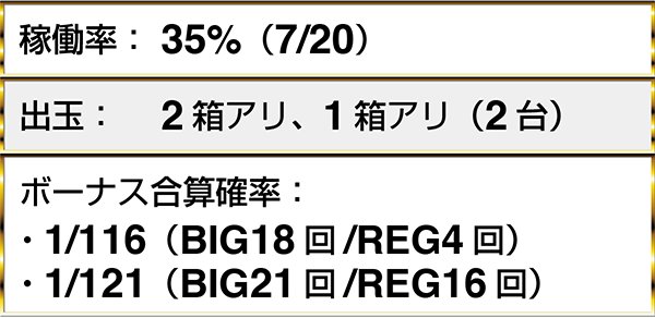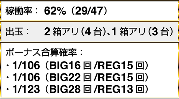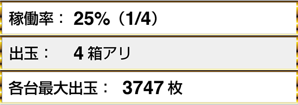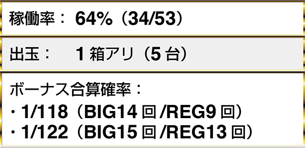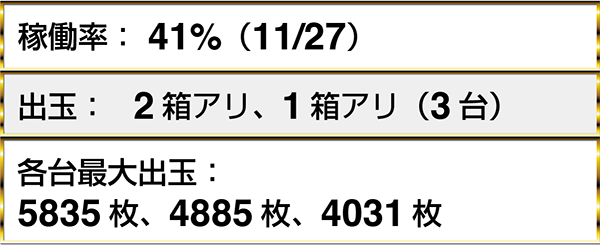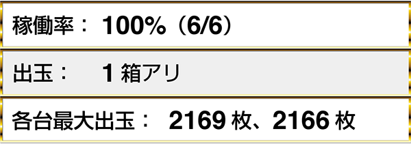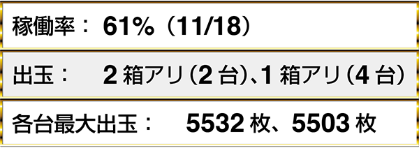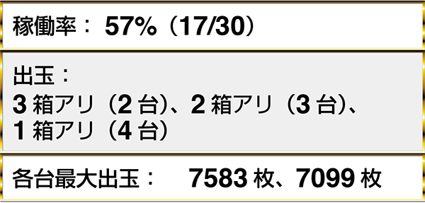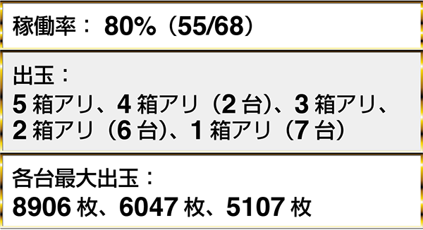 朝イチから高稼働となっていた『バジリスク~甲賀忍法帖~絆』は、午後も稼働率80%over。出玉をみると、17名以上のプレイヤーが1箱以上を獲得し、5箱以上獲得のプレイヤーもみられた。