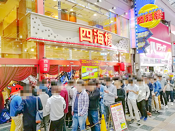 取材日は開店前から200人を超えるスロッターが集合。スタッフによって丁寧に誘導され、店内は徐々ににぎやかさを増していった。
