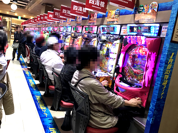 15時ごろの4円パチンココーナーの様子をうかがうと、朝に引き続き「CR大海物語4」や「CR大海物語4 Withアグネス・ラム 遊デジ119ver.」などが盛り上がっており、プレイヤーの遊技に引きつけられるようにシマ全体が活気づいていくのを感じることができた。