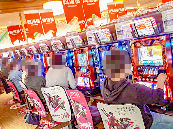 開店直後の店内を見てみると、20円パチスロの「バジリスク~甲賀忍法帖~絆」や「パチスロコードギアス反逆のルルーシュR2 C.C.ver.」が大人気。ほぼ満席となるほどの支持を集めていた。