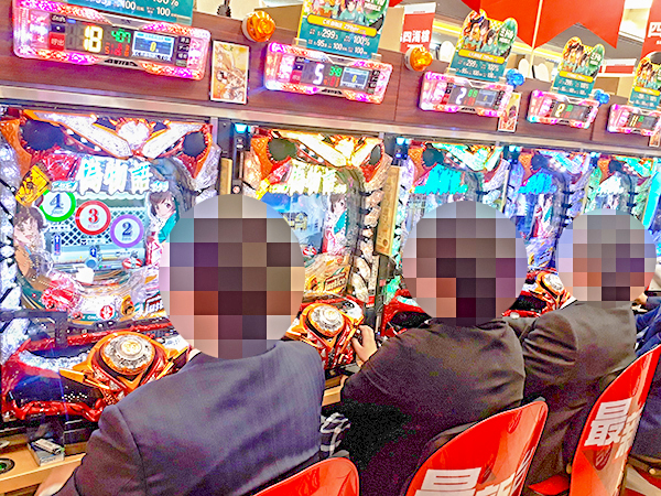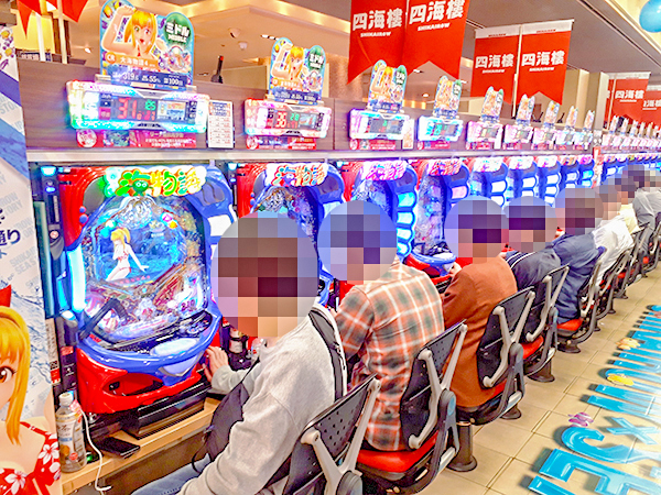 19時を過ぎたころの4円パチンコでは、「CR大海物語4」や「パチンコCR偽物語 299Ver.」、「ぱちんこCR真・北斗無双」が微笑ましい状況。シマ内はプレイヤーの見事な活躍もあってか、明るい雰囲気が感じられた。
