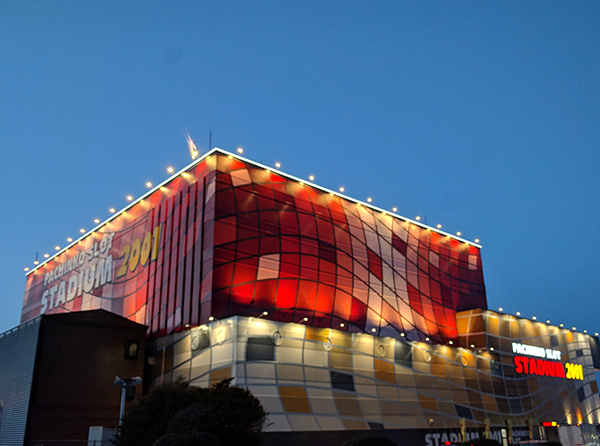 店名が大きく描かれたカラフルな外観が目をひくホールです。