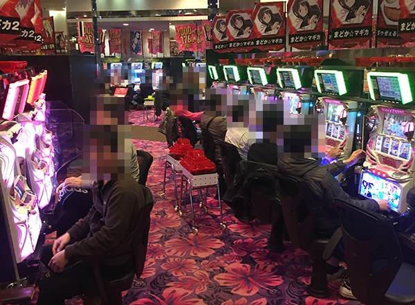 夕方頃の1000円/47枚パチスロをみると、「SLOT魔法少女まどか☆マギカ」や「ミリオンゴッド-神々の凱旋-」が盛況。