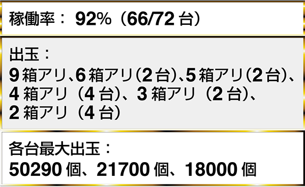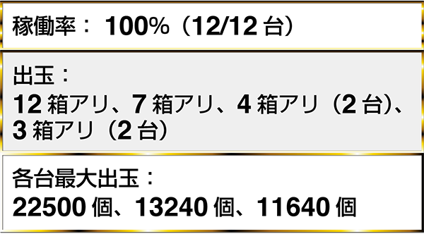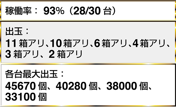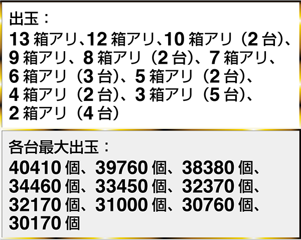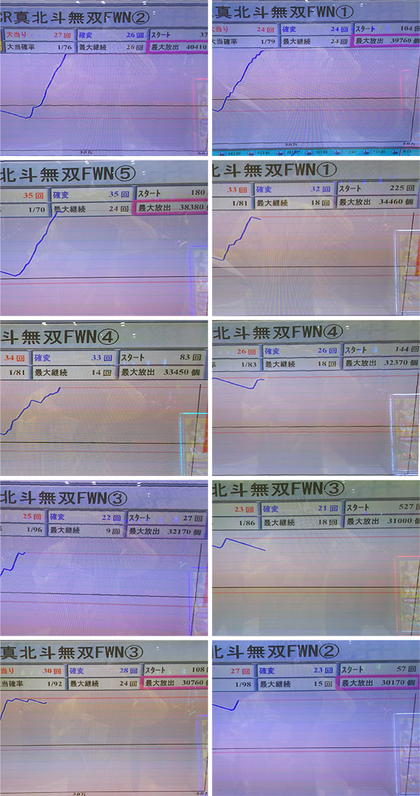『ぱちんこCR真・北斗無双』や『CRビッグドリーム〜神撃259Ver.』をはじめ、4台以上で最大獲得出玉が40000個を超えるデータを確認した。