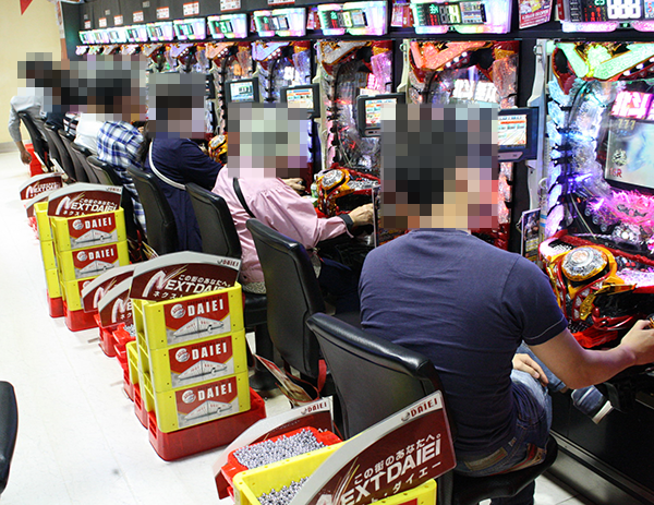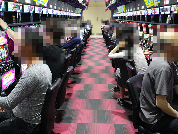 ホール内は大勢のプレイヤーでにぎわっており、パチンコとパチスロの両方から明るいムードが感じられた。