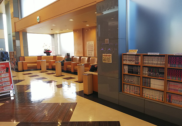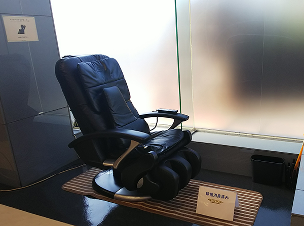 ひとり掛けのソファーが並ぶレストスペースには、マンガやマッサージチェアが用意されている。