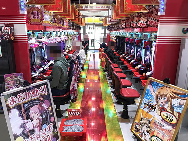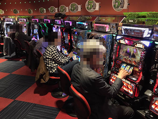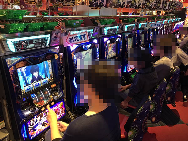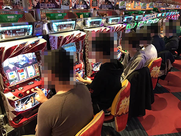 取材時の店内には、様々な層のプレイヤーが来店。パチンコ・パチスロ共に、多くの機種が支持を集めていた。