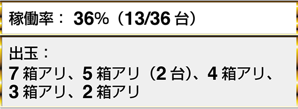 人気を集めていた『CRスーパー海物語IN沖縄4』では7箱の出玉を確認した。