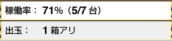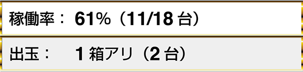 バラエティコーナーの『SLOTギルティクラウン』や『戦国コレクション3』、設置台数の多い『ニューキングハナハナ-30』などに1箱以上の出玉を獲得しているプレイヤーがみられた。