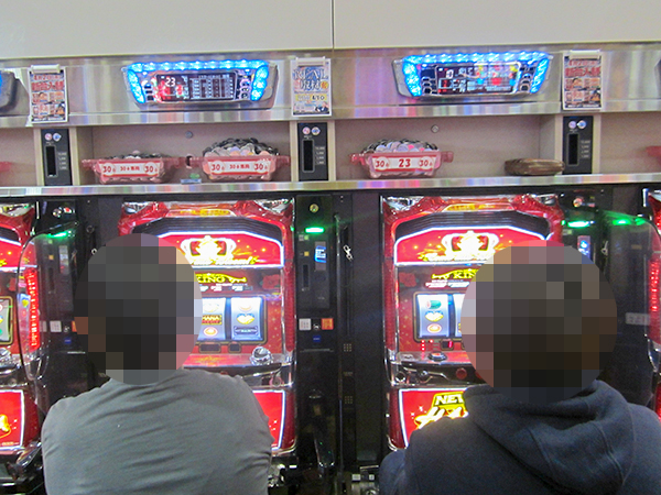 朝から人気の高い「バジリスク~甲賀忍法帖~絆」のほか、「ミリオンゴッド-神々の凱旋-」も賑やかな状況。プレイヤーの華麗なパフォーマンスを目にしている。