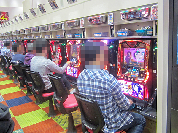 朝イチに多くのプレイヤーが向かったのはパチスロコーナー。「バジリスク~甲賀忍法帖~絆」が満席状態と、かなりの人気となっていた。