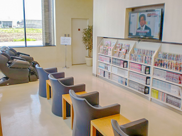 同店のレストスペースにはテレビや漫画本、さらにマッサージチェアまでも用意されており、心身ともにリラックスできる環境が整っている。