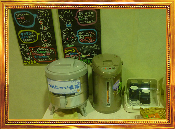 休憩スペースに設置された手書きの看板にも注目をした。味わいのあるイラストはかわいらしく、あたたかみも感じられるポイントであった。