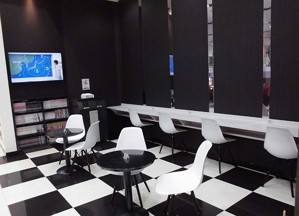 黒と白で統一されたオシャレなレストスペースも印象的。テレビや漫画本が完備されているため、空き台を待つ時間なども退屈せずに過ごせそうだ。