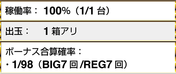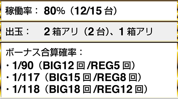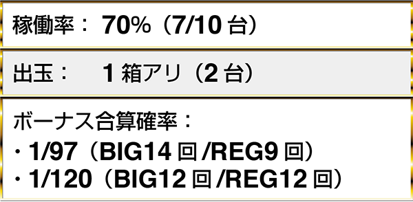 『ニューキングハナハナ-30』と『アイムジャグラーEX-AE』をあわせた5台以上で、ボーナス合算確率1/120以下のデータを確認した。
