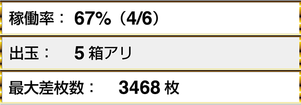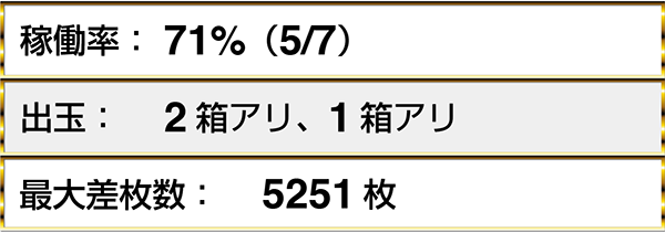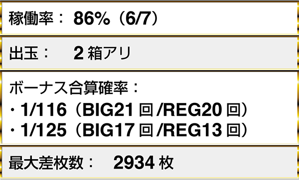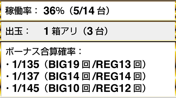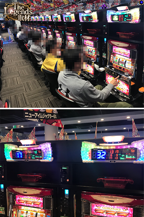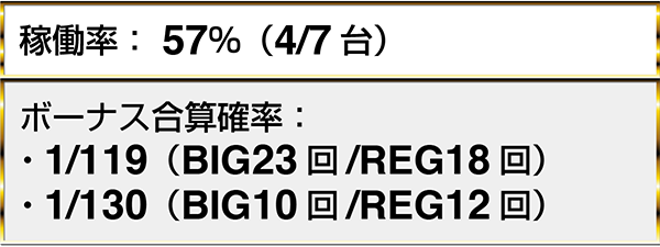 『ニューアイムジャグラーEXーKT』や『マイジャグラーⅢ』といったジャグラーシリーズにボーナス合算確率1/130以下が7台。BIGとREGをバランスよく獲得しているプレイヤーも多かった。