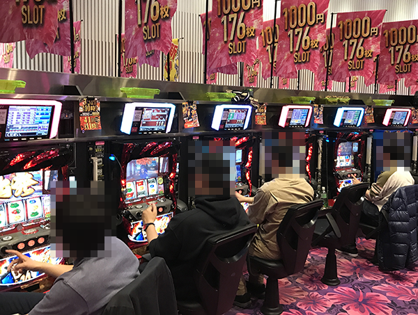 「押忍!番長3」や「バジリスク~甲賀忍法帖~絆」を中心に、1000円/176枚パチスロも盛況。華やかな展開に、思わず顔がほころぶといった姿も目にしている。