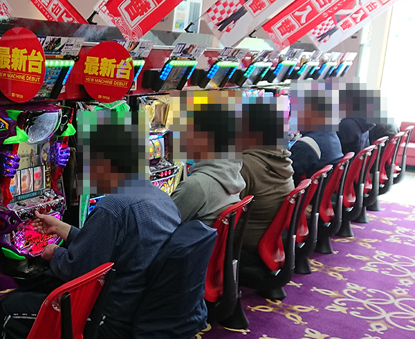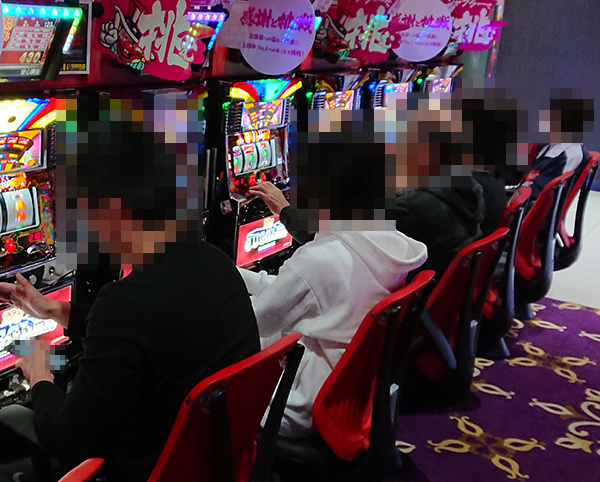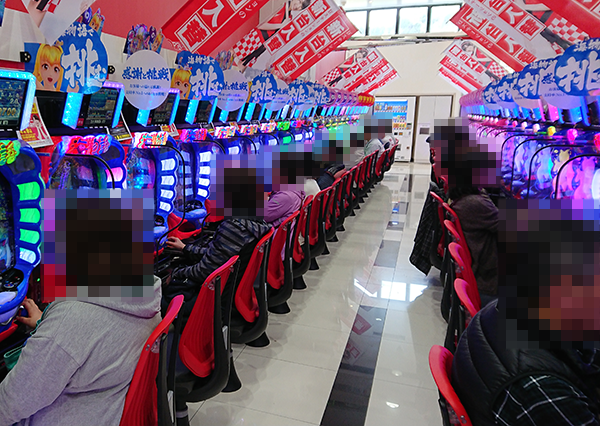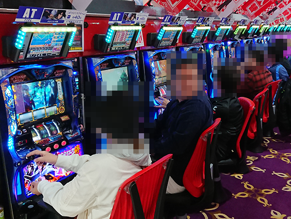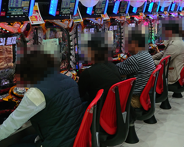 14時頃のパチスロでは、「バジリスク~甲賀忍法帖~絆」や「押忍!番長3」、「ミリオンゴッド-神々の凱旋-」が高稼働。老若男女を問わず、多くのプレイヤーに楽しまれており、明るいムードが感じられた。