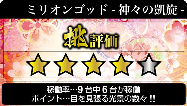 「ミリオンゴッド-神々の凱旋-」に広がる光景をみれば、誰もが驚きの表情を浮かべずにはいられないだろう!! 機種のポテンシャルを最大限に発揮しているといった美しいパフォーマンスは、まさにアメイジング!