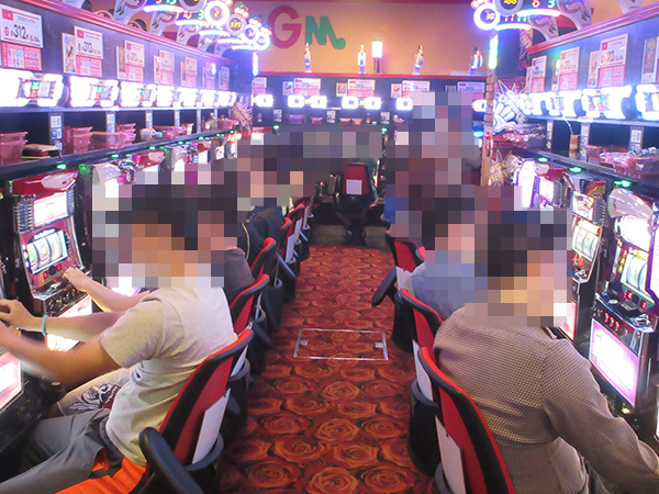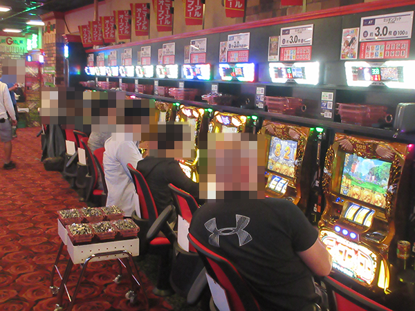 午後のパチスロに目を向けると、「ミリオンゴッド-神々の凱旋-」のにぎわいが大きい。機種の性能を引き出しているといったプレイヤーが多く、シマ全体に魅力的な光景が広がっていた。