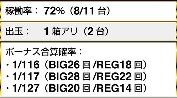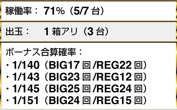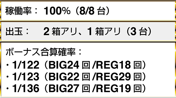 ・『ゴーゴージャグラー』は8台中2台がボーナス合算確率1/130以下