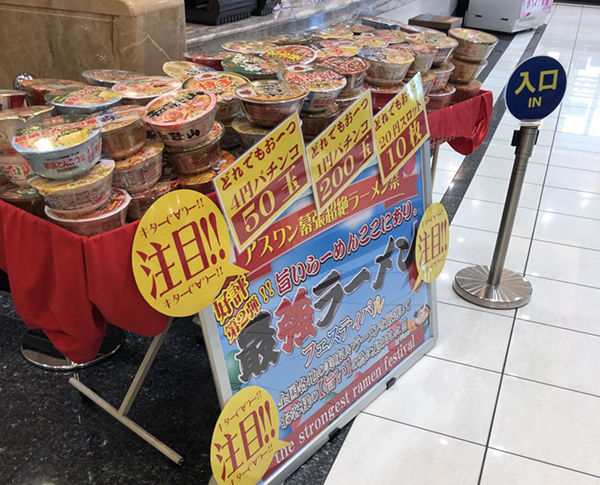 賞品コーナーにて、最強ラーメンフェアなるものを発見。全国各地のカップ麺が並ぶ光景は実に壮大であった! オリジナリティを感じられるポイントも魅力のひとつだろう。