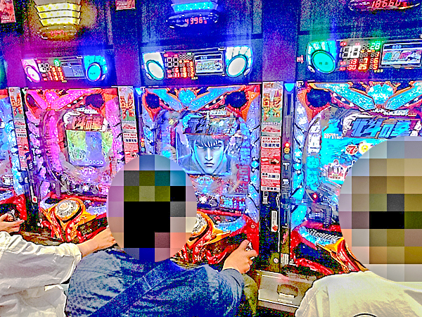 14時ごろの4円パチンコをチェックすると、「ぱちんこCR北斗の拳7 転生」や「CRフィーバー戦姫絶唱シンフォギア」などで、機種性能を堪能するプレイヤーを確認。シマのあちこちで華やかなシーンを目にしている。