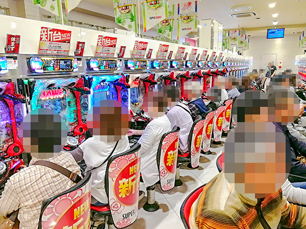 同店は東海道本線・立花駅から徒歩圏内と好立地。取材日もたくさんのプレイヤーが来店し、パチンコ・パチスロの各シマがにぎわいを見せていた。