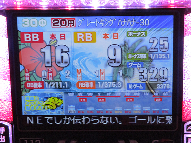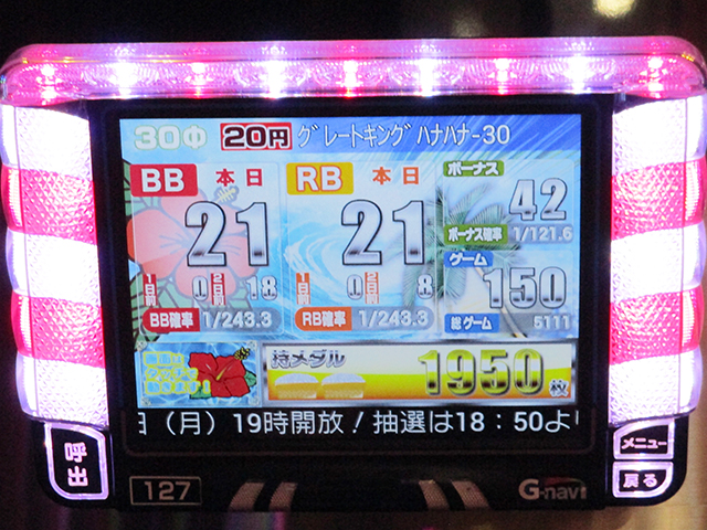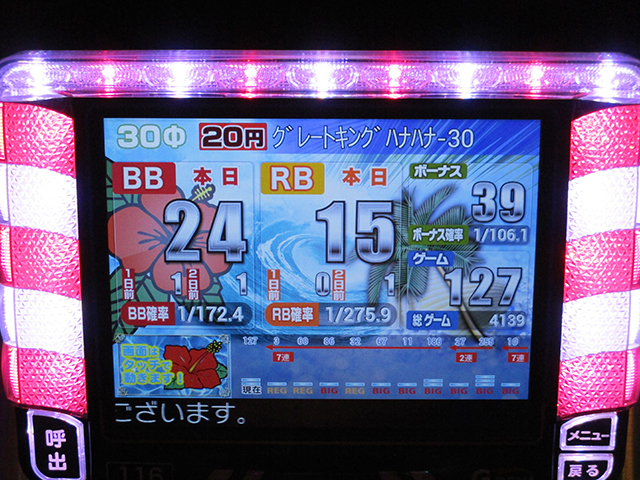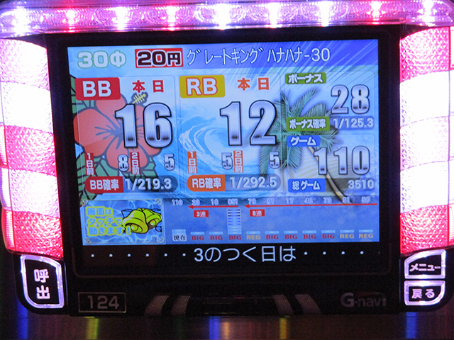 ザッと台上のデータ機器を見ただけで、状況の良さが窺えたのは全16台の『グレートキングハナハナ-30』。