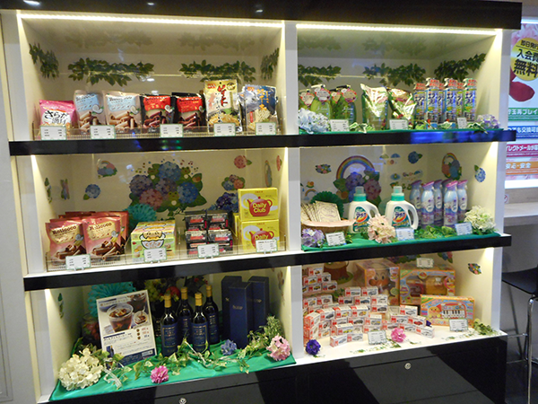 美味しそうなコーヒーやお菓子、日用品などが並ぶ賞品コーナーも魅力に感じられたポイント。陳列棚にあじさいをイメージさせる装飾が施されているなど、季節を感じられる空間にもなっていた。